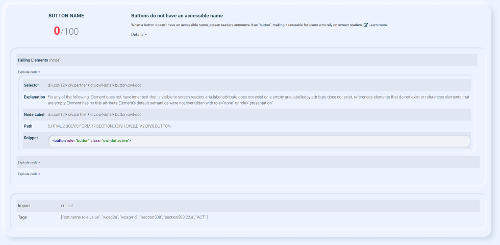 Quando un pulsante non ha un contenuto testuale o una proprietà aria-label, SeoChecker lo segnalerà.